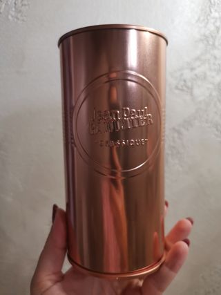 Perfume Classique Essence de Jean Paul Gaultier en formato de 50ml. - Envase metálico con acabado dorado. - Diseño circular en relieve con el nombre de la marca.