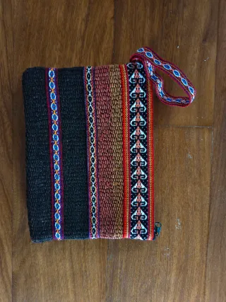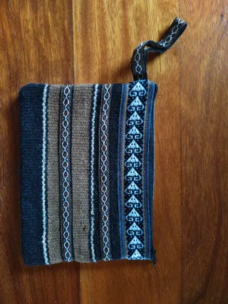 Necesser artesanal del Perú, amb un disseny de ratlles i motius geomètrics. - Teixit a mà. - Tancament de cremallera. - Nansa per penjar. El preu és la unitat