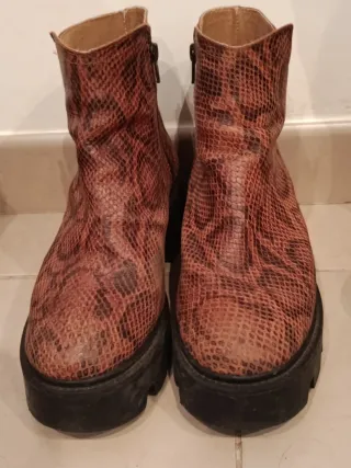 Conjunto de botas altas y de media caña en tonos marrones y multicolor. - Botas altas de cuero. - Botas de media caña con estampado de serpiente.