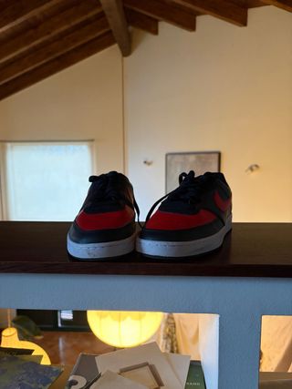 Nike Dunk Low en color negro con detalles en rojo (Swoosh grande rojo). Talla 41 EU (perfecta para hombre o unisex). Estado: Poco usadas, cuero en muy buen estado sin roturas ni rayones grandes. Solo la suela un poco sucia del uso normal (se limpia fácil con un cepillo y jabón). Interior limpio, cordones originales en buen estado. Vienen con la caja original. Precio negociable en persona. Envío disponible.