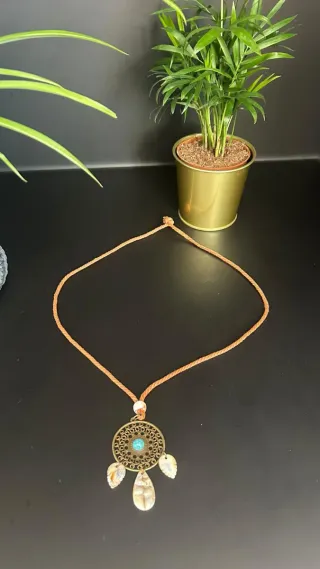 Collar con un diseño inspirado en la naturaleza y un toque bohemio. - Colgante circular con detalles calados. - Piedra central de color turquesa. - Adornos en forma de hoja y lágrima. - Cordón ajustable de hilo.