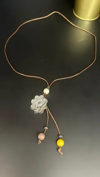 Elegante collar con un diseño único. - Colgante central con forma de flor. - Cordón ajustable. - Dos cuentas decorativas en los extremos.
