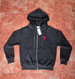 Sudadera Ami Paris con el icónico corazón rojo bordado. - Sin usar y con etiqueta. - Cierre de cremallera. - Bolsillo frontal tipo canguro. - Detalles preciosos.