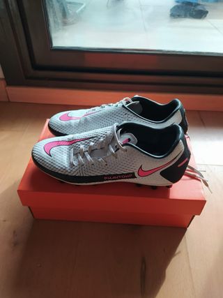Botas de fútbol Nike Phantom GT Academy AG blancas y rosas Bastante uso pero muy bien cuidadas. Tienen algo de restos de pegamento de esparadrapo en la parte del talón (penúltima foto), con algo de esfuerzo se limpia bien. Las vendo con caja original, aunque algo estropeada por la parte de abajo (última foto) Cualquier duda contactar sin compromiso!