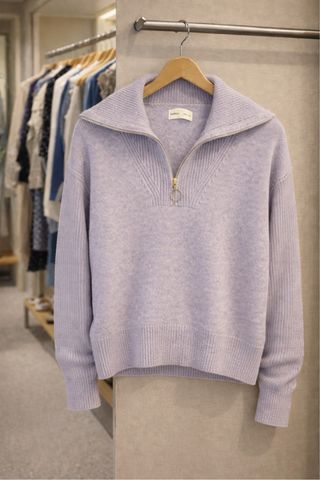 Jersey de punto fino con cuello alto y detalle de cremallera. Color azul clarito - Manga larga. - Puños y bajo acanalados. - Diseño con costuras en V en el pecho.