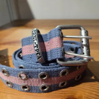Cinturón de tela con un diseño de rayas en tonos azules y rosas. Cuenta con una hebilla metálica y ojales a lo largo de la cinta. - Diseño de rayas. - Hebilla metálica. - Ojales metálicos.