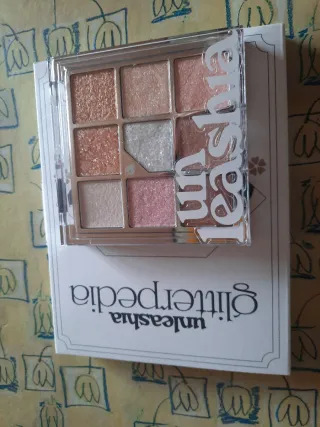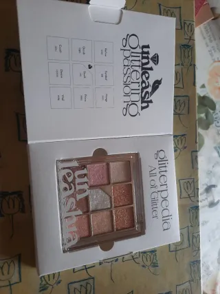 Paleta de sombras de ojos Unleashia Glitterpedia. - Incluye 9 sombras con acabado glitter. - Tonos variados en oro y rosa.
