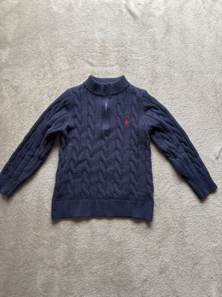 Jersey de Polo Ralph Lauren con diseño de punto trenzado. - Color azul marino. - Cuello alto con cremallera. - Logo bordado en rojo en el pecho.