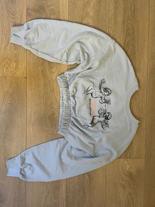Sudadera crop top de color azul claro con un diseño de dos ángeles y texto. - Diseño de dos ángeles. - Texto Darling you are different.