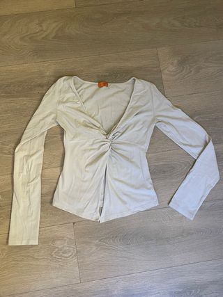 Top de manga larga con un diseño moderno y favorecedor. - Tejido suave y cómodo. - Escote pronunciado con detalle de nudo. - Corte central en la parte delantera.