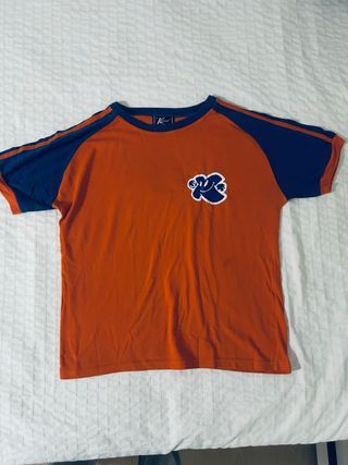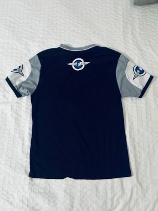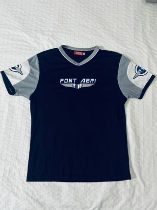 Camiseta con diseño deportivo de Pont Aeri. - Mangas grises con detalle blanco y azul. - Cuello en V con ribete gris. - Estampado frontal PONT AERI con alas.