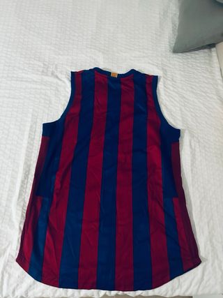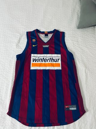Camiseta de baloncesto del FC Barcelona con el patrocinador Winterthur. - Diseño a rayas rojas y azules. - Logo de Nike. - Escudo del FC Barcelona.