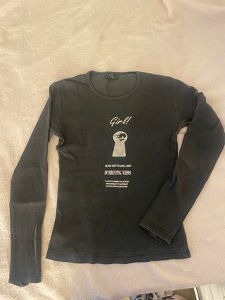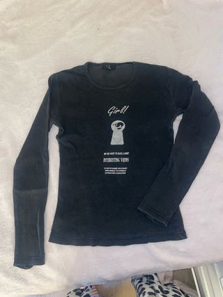 Camiseta negra de manga larga con un diseño gráfico frontal. - Estampado Girl! con un ojo mirando a través de una cerradura. - Texto adicional DO YOU WANT TO HAVE A LOOK? INTERESTING VIEWS 75 SOUTH NAKED EYE STREET OPEN MONDAY TO SATURDAY SATISFACTION GUARANTEED. - Cuello redondo.