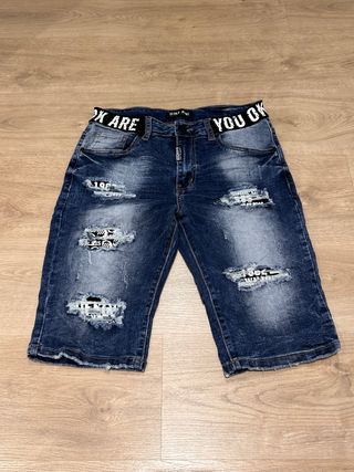 Pantalón corto de tejido vaquero con un diseño moderno y desgastado. - Cintura elástica con texto. - Efecto desgastado y rotos. - Estilo urbano.