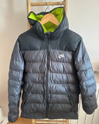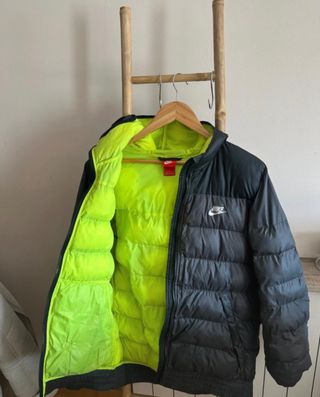 Chaqueta de plumífero con un diseño reversible y llamativo. Ideal para mantenerte abrigado con estilo. - Exterior en color negro. - Interior en color verde brillante. - Logo de Nike visible en el pecho.