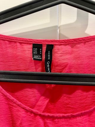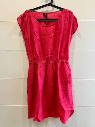 Vestido de Mango con un vibrante color rosa. Su diseño es ligero y cómodo, ideal para el día a día. - Tejido con textura. - Cintura elástica. - Mangas cortas.