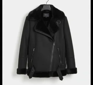 Abrigo estilo biker con exterior de ante y forro interior de pelo. Cierre cruzado con cremallera y detalles de cintas en puños y bajo. Nuevo sin etiquetas talla S Stradivarius - Cuello con solapas y detalle de hebilla. - Bolsillos laterales con cremallera.