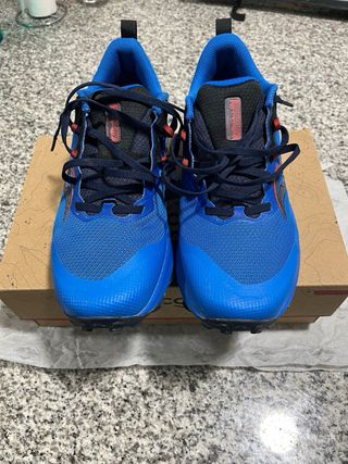 Zapatillas de trail running Saucony Peregrine 14 en color azul. - Diseño deportivo. - Detalles en color rojo.