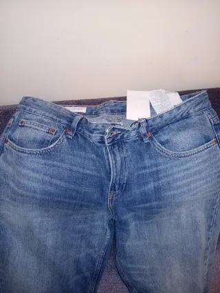 Vaqueros de corte recto de la marca Zara. - Cintura alta. - Cierre de cremallera y botón. - Bolsillos delanteros y traseros. Con etiquetas. Es una talla 42 justita en la zona de barriga.