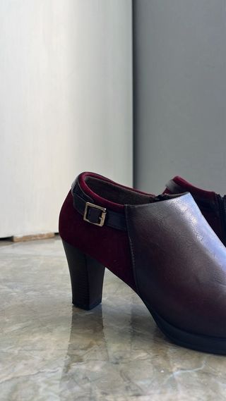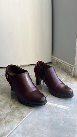 Elegantes botines de mujer en color burdeos. - Diseño de caña baja. - Tacón grueso para mayor comodidad. - Muy poco uso, en excelente estado -Incluyen caja original y fundas protectoras -Cierre lateral con detalle de hebilla decorativa -Diseño moderno y fácil de combinar (Usados 1 vez) Precio algo negociable