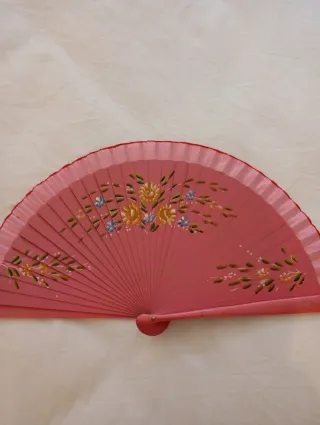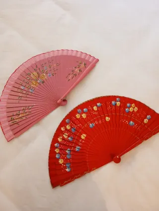 Conjunto de dos abanicos de madera con delicados diseños florales pintados. - Abanico principal en tono rosa pálido con flores amarillas y azules. - Segundo abanico en rojo vibrante con detalles florales en azul y amarillo. - Material: Madera.