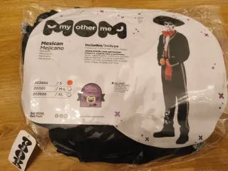 Poncho y sombrero mexicano. El poncho es de lana, confeccionado en América. Es una prenda que usan allí, no es un disfraz, pero se puede usar para tal fin. Puede ser para niño/a llevado como poncho hasta los pies, o para adultos como poncho/chaleco amplio como prenda de arriba. El sombrero es de paja trenzada y de colores, con cuerta para el cuello.