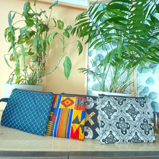 Conjunto de monederos con diseños vibrantes inspirados en África. - Monedero con estampado de escamas azules. - Monedero con patrón geométrico multicolor. - Monedero con diseño de X y O en negro y blanco. - Monedero con motivos geométricos en blanco y negro.