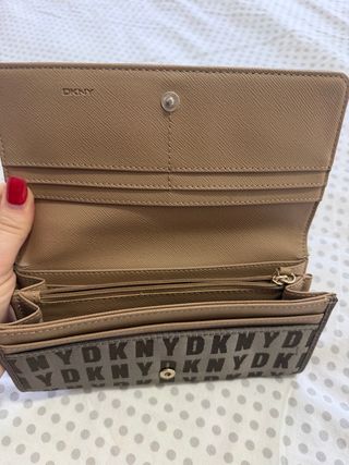 Cartera Billetera-Monedero de la marca DKNY. Tiene para los billetes, monedas y tarjetas. En la apertura le falta la poética con las letras porque se me perdió. Va con su funda. Esta usada.