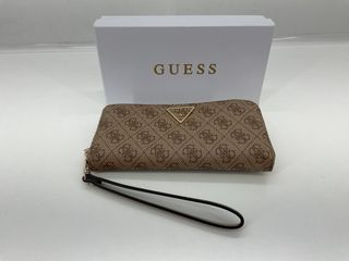 Monedero de la marca Guess con un diseño elegante. - Combinación de colores marrón y beige. - Incluye asa para llevarlo en la mano.