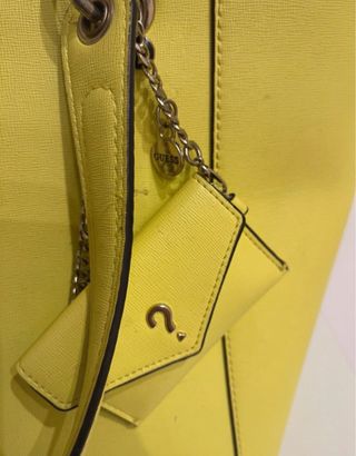 Bolso de mano Guess en llamativo color amarillo. Cuenta con un diseño elegante y práctico, perfecto para el día a día. - Logo de Guess en triángulo metálico. - Incluye un pequeño monedero colgante con cadena. - Asas cómodas para llevar en la mano o el antebrazo.