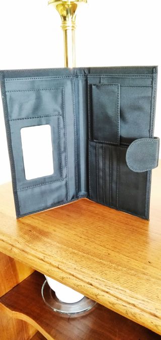Billetero/monedero en tela de color negro, NUEVA, conserva su bolsa de plástico para guardarla y en su interior papeles de seda. El interior está dividido en un compartimento grande para billetes, que ocupa todo el ancho de la cartera, en su parte izquierda tiene un compartimento grande y otro dos mas pequeños, uno de ellos con ventana para ver su interior. En la parte de la derecha tiene un compartimento grande y 4 compartimentos tamaño DNI y uno para monedas. La cartera se cierra con un automático. Medidas de la cartera abierta: 23 cm de ancho, alto 20 cm. Medidas de l