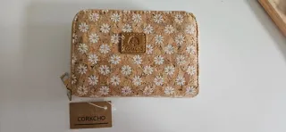 Monedero con un bonito estampado de flores blancas sobre fondo de corcho. - Diseño con cierre de cremallera. - Compartimento frontal con botón a presión. - Incluye correa de muñeca. Comprado en Portugal, totalmente nuevo, vale para tarjetas y monedas.