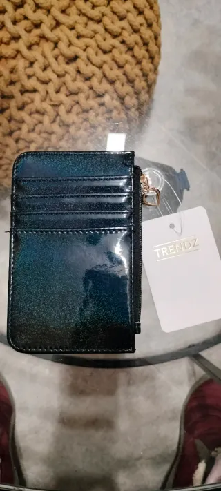 Práctico tarjetero con monedero incorporado. - Diseño brillante con efecto tornasolado. - Múltiples ranuras para tarjetas. - Compartimento con cremallera para monedas. - Detalle de corazón en la cremallera.
