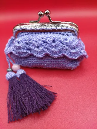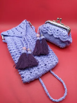 Práctico bolsito tejido a mano, ideal para llevar tu móvil y monedero para las monedas. - Incluye asa larga. - Cierre con cordón. Bolsito 8€ Monedero 8€ Conjunto 14€