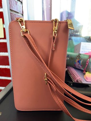 Cartera para guardar movil, tarjetas y dinero. Sin estrenar con correa incluida. En perfecto estado color salmon. Buena calidad y muy cómodo