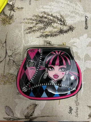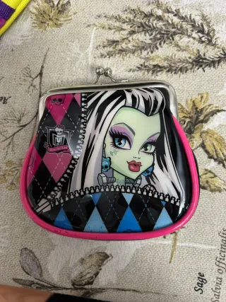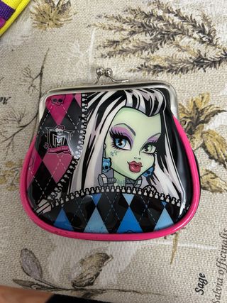 Monedero con diseño de Frankie Stein de Monster High. Ideal para guardar monedas o pequeños objetos. - Cierre de broche metálico. - Diseño frontal con cremallera y estampado. - Ribete exterior en color rosa fucsia. A estrenar