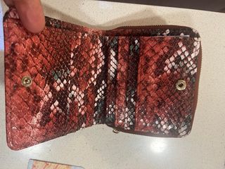Cartera monedero con un llamativo estampado inspirado en la piel de serpiente. Precio negociable. - Diseño multicolor con tonos rojos, blancos y turquesas. - Cierre de cremallera.