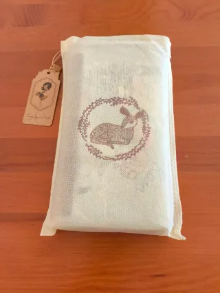 Cartera monedero con un diseño primaveral. - Estampado de un conejo rodeado de hojas. - Cierre de cordón. - Incluye etiqueta decorativa con un dibujo.