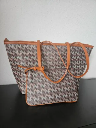 Bolso de mano con un diseño geométrico en tonos beige y marrón. Incluye un monedero a juego. - Monedero con cierre de lazada. - Asas de cuero sintético.