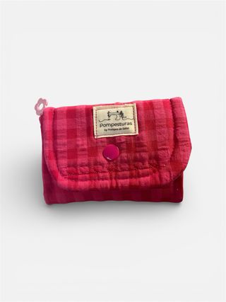 Pequeña carterita con un bonito estampado de cuadros vichy en tonos rosa y rojo. - Diseño de cuadros vichy. - Compartimentos para tarjetas y billetes. - Monedero interior con cremallera. - Hecho a mano.