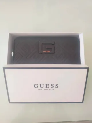 Monedero color negro, con cierre perimetral de cremallera metálica en tono dorado. Exterior con acabado acolchado y logotipo metálico frontal de la marca. Interior con varios compartimentos para tarjetas, billetes y un bolsillo central con cremallera para monedas. Se entrega con su caja original Guess Los Angeles.Presenta desgaste visible en las esquinas exteriores indicado en fotos, principalmente estético, sin afectar al funcionamiento de la cremallera ni a los compartimentos interiores.