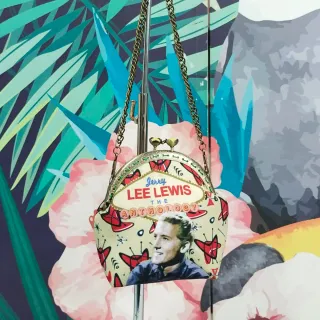 Original monedero estilo rockabilly con diseño cantante años /50s Medidas 14 cm alto cadena aparte ancho 14 cm - Cierre de boquilla metálico. - Cadena para colgar./20 cm Interior forrado