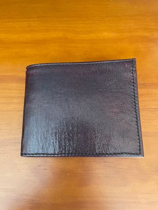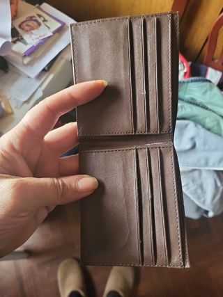 con espacio para monedas, billetes y tarjetas. tiene un poco de pegamento en la parte de dentro (se ve) de haber llevado una foto pegada