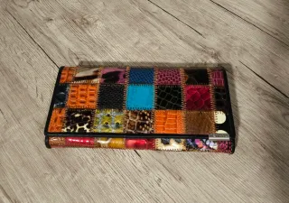 Monedero grande de la marca Desigual con un diseño patchwork. - Múltiples paneles de cuero en diferentes tonos. - Costuras decorativas en contraste. - Detalle metálico con el logo de la marca.