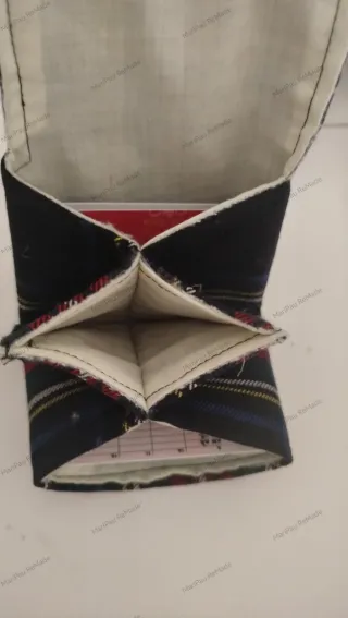 Práctico monedero-tarjetero con un diseño de cuadros escoceses. Cierre de botón metálico. Hecho a mano, con tela traída de Escocia. Productos únicos y limitados procedentes del reciclaje para un consumo más consciente - Tejido resistente. - Diseño a cuadros en tonos azules y rojos. - Pequeño tamaño