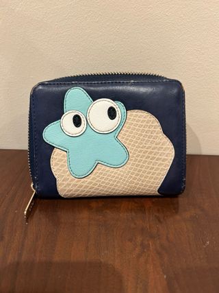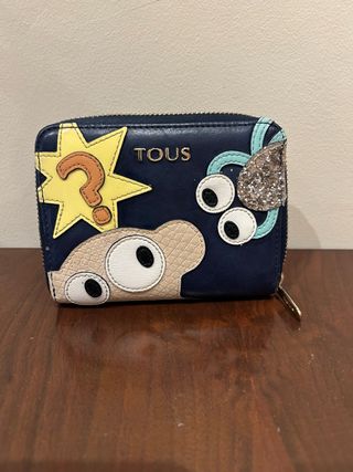 Monedero original TOUS de piel, con diseño multicolor Está usado y estropeado, con signos visibles de uso, tal y como se aprecia en las fotos, pero las cremalleras funciona bien. - Cierre de cremallera. - Detalles de personajes y un signo de interrogación. - Acabado brillante en una de las aplicaciones.