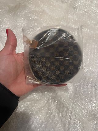 Elegante monedero de piel con detalles dorados. - Diseño circular. - Cierre de cremallera.