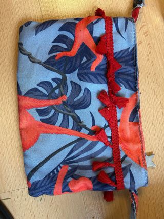Monedero con un bonito estampado. - Diseño con motivos. - Incluye asa y detalle de flecos.