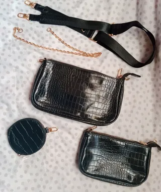 Juego de tres piezas qué contiene 2 bolsos y un monedero con estampado negro de cocodrilo y detalles en dorado. Asas intercambiables. Medidas:24 cm x 13 cm/ 19 cm x 11 cm/ 10 cm.