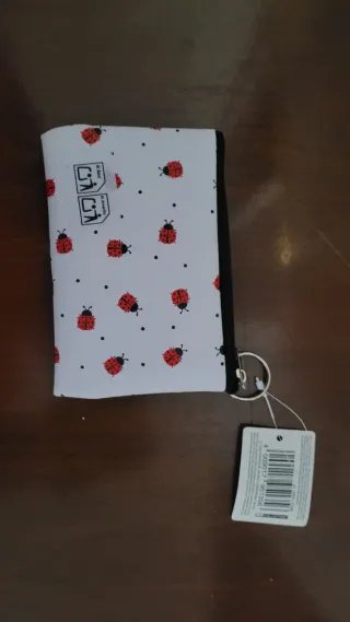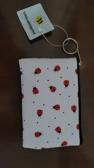 Práctico estuche con un divertido estampado de mariquitas. Puede usarse como llavero o monedero. - Diseño con mariquitas rojas y puntos negros. - Cierre de cremallera. - Incluye aro para llavero.